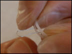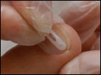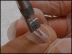 Die podofix Aktiv-Klebespange wird an die Nagelform angepasst und ohne Vorspannung auf den Nagel geklebt. Anschließend wird sie durch Verdrillen des eingearbeiteten Drahtes aktiviert. Dadurch werden die Nagelränder leicht angehoben und das umliegende Gewebe entlastet.